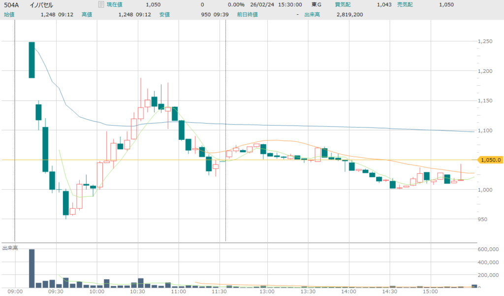 イノバセル(504A)IPOの初値結果 イノバセル(504A)の初値結果です。初値は公開価格1,350円を約7.6%下回る1,248円となりました。初値形成時の出来高は525,600株です。 (5分足チャート) 公開価格からの下落率は7.56%、初値売りで10,200円の損失です。当… -