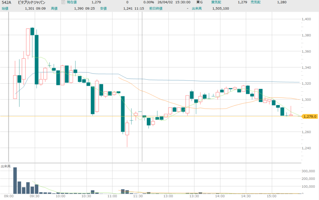 ビタブリッドジャパン(542A)IPOの初値結果 ビタブリッドジャパン(542A)の初値結果です。初値は公開価格1,370円を約5.0%下回る1,301円となりました。初値形成時の出来高は259,900株です。 (5分足チャート) 公開価格からの下落率は5.04%、初値売りで6,… -