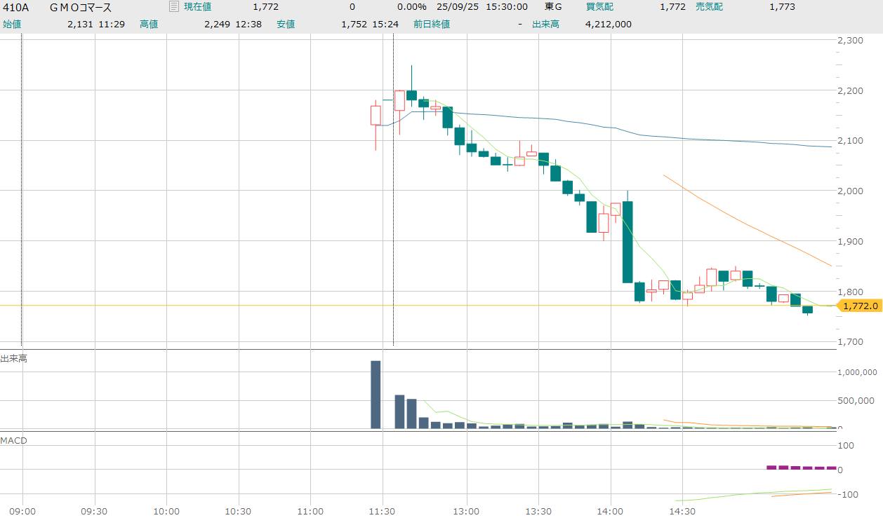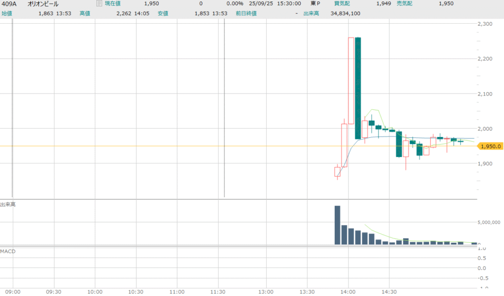 初値形成後は値を飛ばし、わずか10分ほどで約400円も上昇しましたが一転急落し、14:40頃には1,881円まで下落し初値に接近しました。