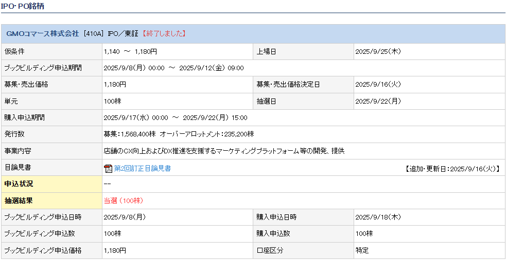 GMOコマース(410A)の公開価格は、上限である1,180円で決定しています。