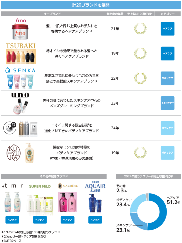 主にヘアケア、スキンケア、ボディケアの3本柱で20ブランドを展開しています。キーブランドはいずれもロングセラーで見知った商品もありますね。