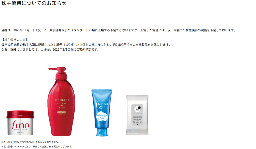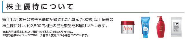 個人投資家対策と考えられますが、100株で2,500円相当の株主優待の導入が決定しています。食品なら優待目当てでの取得も容易に考えられますが、こういったシャンプーやケア用品ではどれほどの需要があるのでしょうか。