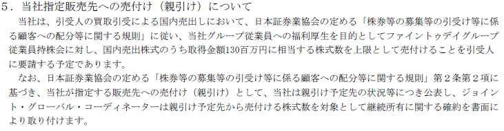 親引け | 有(1.3億円相当≒88,435株) |