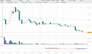 その後の動きも非常に強く、13:47にストップ高である454円に達し、直後に大きく売り込まれますがすぐに戻して、今度は14:20頃にストップ高に貼り付き、そのまま本日の取引を終えています。