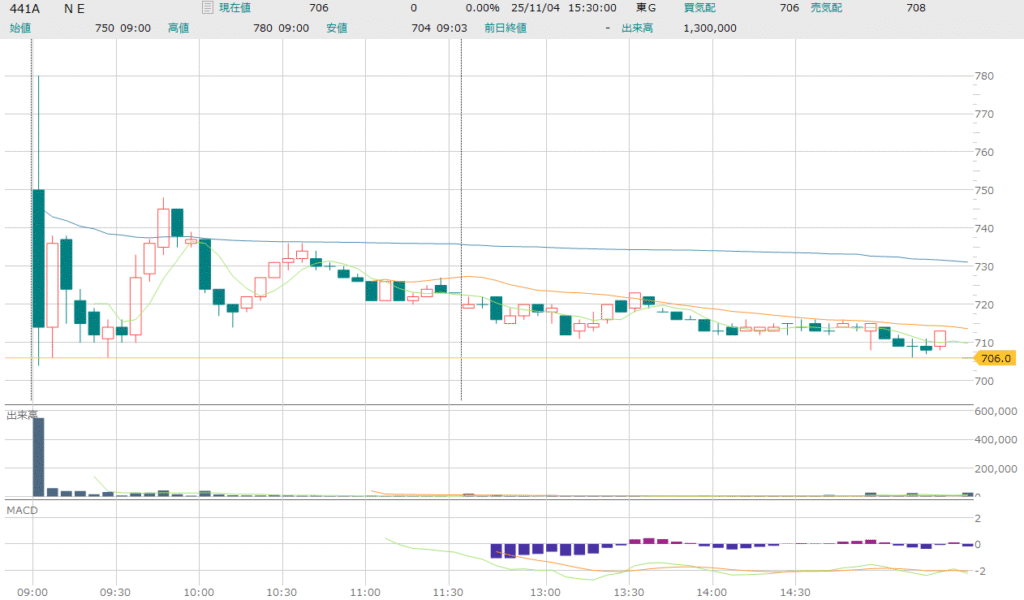 初値形成後は直後に780円の高値をつけたと思えば、一気に704円まで急落しました。9:30~10:00前にかけて戻すも公開価格まで戻す力は残っておらず、その後は右肩下がりのチャートを描き、安値圏で終了となりました。