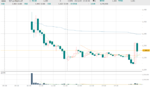 初日の上限は3,270円(1,390円×2.3倍≒3,200円 3,200円+通常の更新値幅分70円)ですので上限いっぱいでの初値形成となりました。