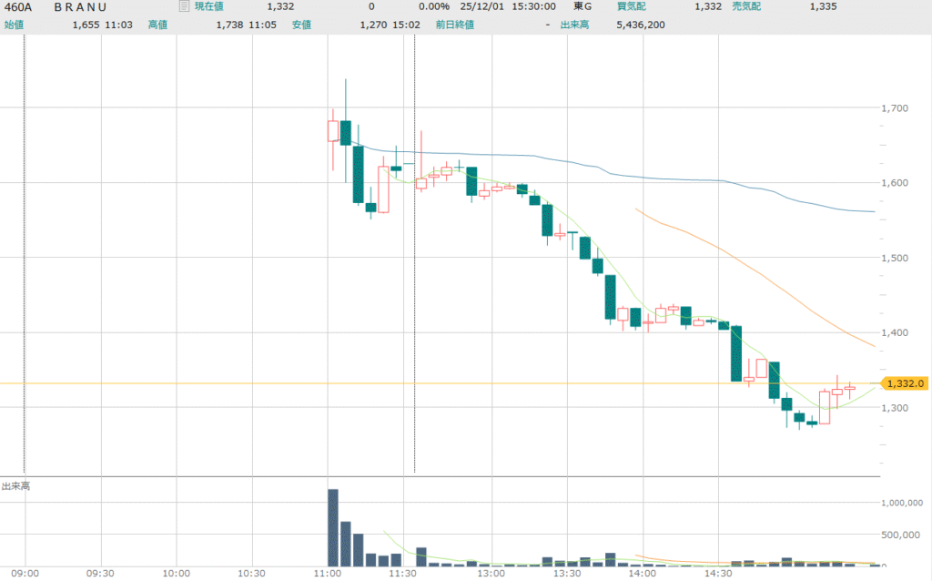 本銘柄の初日の動きは残念でしたが、先日上場したHUMAN MADEは上場初日の終値3,545円に対して上場3日目の12/1の終値は4,460円になっており、2営業日で25.8%(915円)も上昇しています。