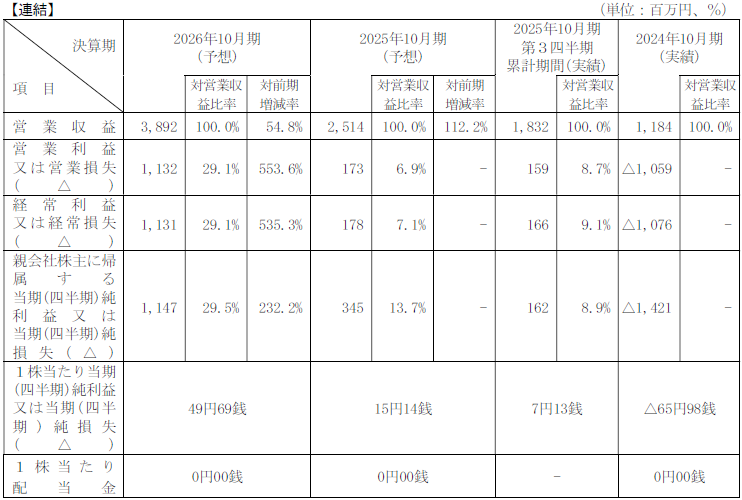 上場までに期末を迎えるIPOの場合、進行期の予想のみ開示する企業が見受けられますが、来期(2026/10期)の予想も開示しており、この姿勢は好感できます。
