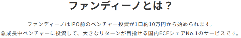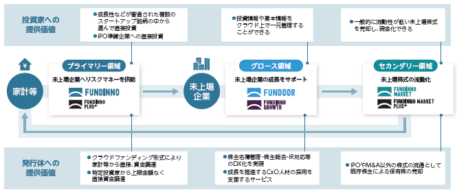 「未上場企業エクイティプラットフォーム事業」を展開しており、 「FUNDINNO」は、国内初・国内シェアNo.1のECF(株式投資型クラウドファンディングサービス)を提供するプラットフォームです。