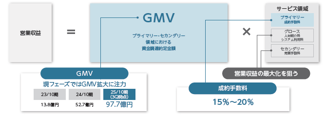 連結営業収益の88.7%(2025/10期 3Q累計)をプライマリー領域が占めており、主にスタートアップ企業がプラットフォームで行った資金調達が成約した時点で収受する成約手数料です。