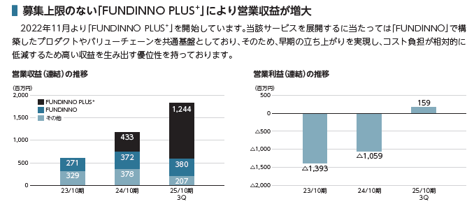 また、2022/11より募集上限のない「FUNDINNO PLUS+」を開始しており、「高い収益を生み出す優位性を持つ」の説明の通り、営業収益の7割弱を占める25/10期 3Q累計では、これまで万年赤字の様相を呈していましたが、ついに黒字転換となっています。
