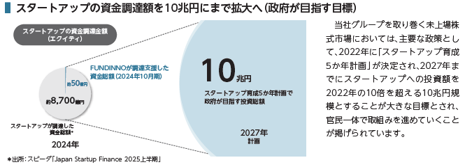 日本政府は2027年までにスタートアップへの投資額を2024年の0.87兆円の11倍を超える10兆円規模とし、官民一体で取り組みを進めていくことが掲げられています。