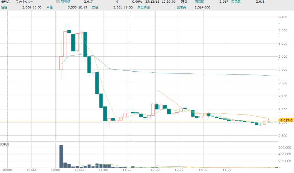 初値形成後はあっという間にロックアップ解除ラインである3,300円を突破し、3,350円の高値をつけましたが、高値からの下落もあっという間でした。