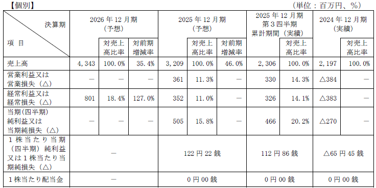 今期に黒字転換が見込まれており、来期予想についても経常利益までの開示となっていますが、来期の経常利益は120%超の増益予想ですので、法人税等の関係から単純に当期純利益も120%伸長とまではいきませんが、大幅増益が見込めそうです。