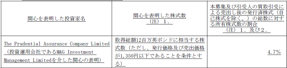 関心の表明は合わせて2,351,500株となり、公募・売出の22.41%に相当します。