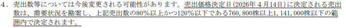 また、売出株式数は80%(760,800株)~120%(1,141,000株)の範囲で変更される可能性があります。
