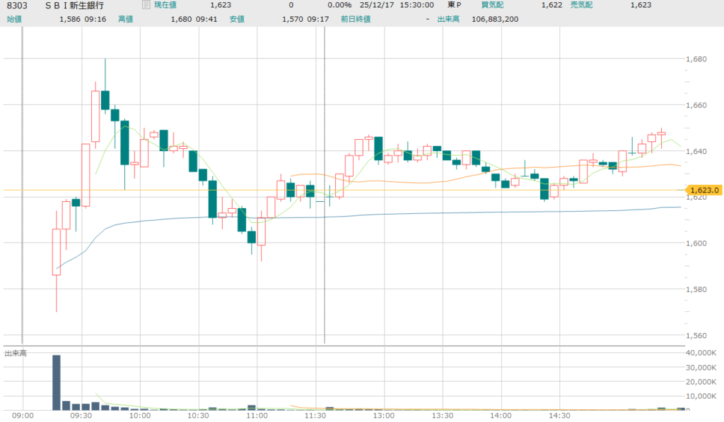 初値をつけた後は一気に高値の1,680円まで駆け上がるも11時頃まで売り込まれる展開に。後場に入ってからは1,620円~1,640円で推移し、最後は1,623円に下がりましたがなんとかVWAPの1,615円よりも上の位置で本日の取引を終えています。