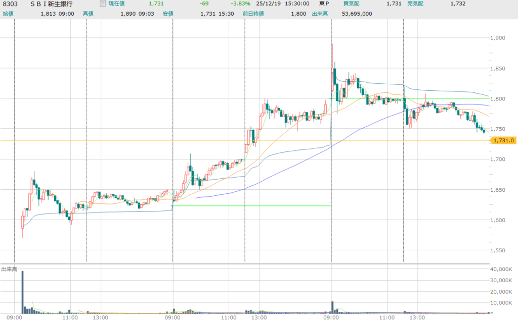 12/19の朝に1,890円の高値をつけてからは1,800円程度で推移し、日銀の利上げが発表された後の後場に入ってからは一気に上昇していたこともあってか、まさに「噂で買って事実で売る」のごとく売りに押される展開に。