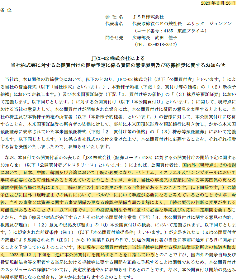 ※JSR(4185)の例:適時開示が2023/6/26、当初の開始目標が2023/12下旬