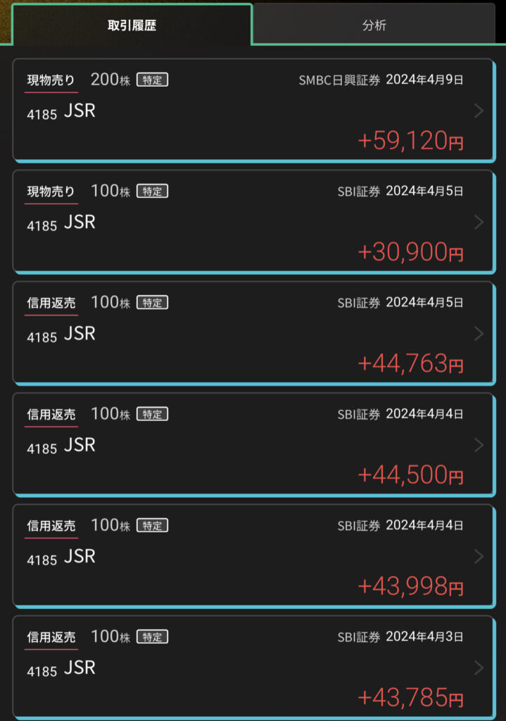 現物・信用合わせて1,500株買い、44.5万円の利益を出すことができました。