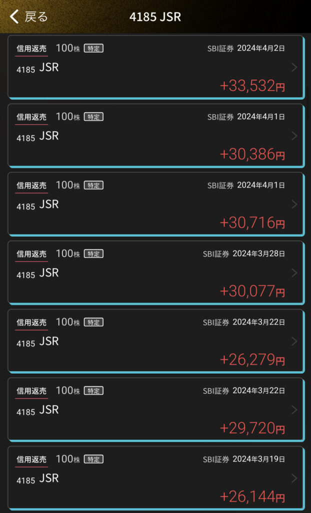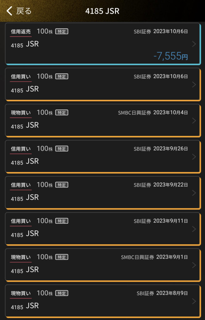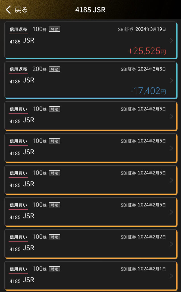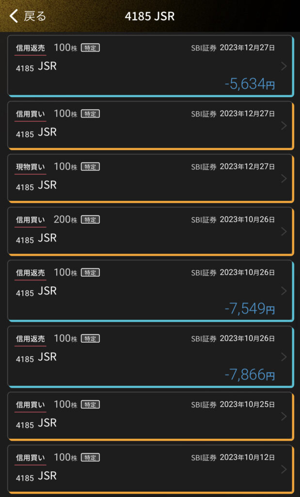 下落が続いたことで迷いが生じ2023/10にはいくつか損切りに踏み切り、年末に利益圧縮のため損出しをしています。その後改めて期間を分散して株数を増やし、利益確定に至っています。