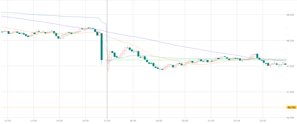 ニュースが伝わると47,400円ほどまで急落し、直後には半分ほど戻す動きが見られましたが、0:00頃には47,500円程になりました。