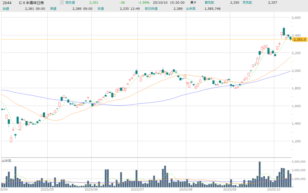 ちなみに、日経平均の8月末(8/29)終値は42,718.47円で10/10終値より5,370円(11.17%)も低く、ETFのグローバルX 半導体関連-日本株式(2644)に至っては8月末(8/29)終値は1,895円で10/10終値より456円(19.40%)も低く、その時点での比較でも割安と考えていましたので、楽観的に構えています。