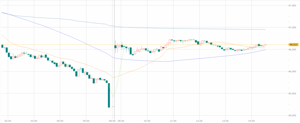 これを受けてか、日経平均先物は10/13 14:30時点で46,600円ほどまで戻しており、10/10の日経平均終値48,088.80円と比較して-1,500円程度にまで下げ幅が縮小されています。